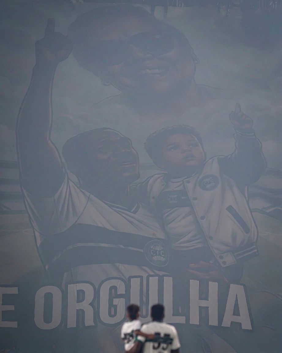 Torcida do Coritiba faz homenagem para zagueiro Jacy ao lado da mãe, vítima de câncer. “Ela se orgulha”, diz o bandeirão. (Imagem: JP Pacheco/Coritiba)