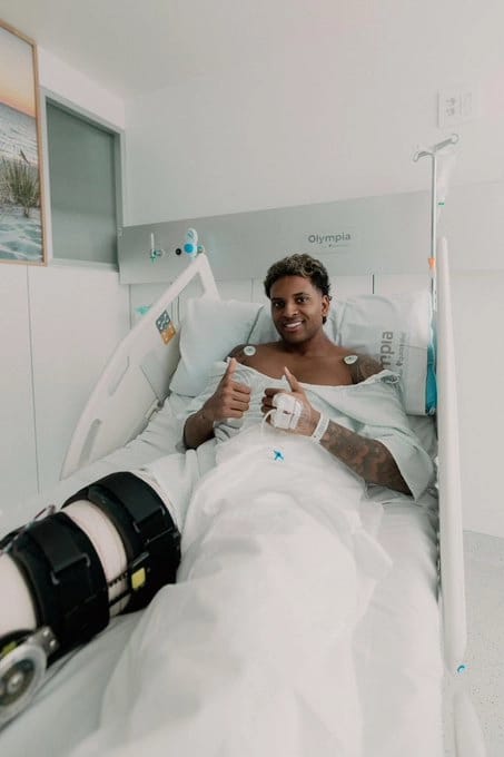 Rodrygo, após cirurgia, depois de romper ligamento cruzado e o menisco exterior do joelho direito. A expectativa de recuperação é de 6 a 12 meses. (Imagens: Redes Sociais | Reprodução)